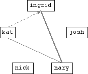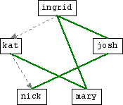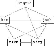 Works with Mary, is friends with Mary and Josh, is acquainted with Kat, and has physically met everyone except Nick